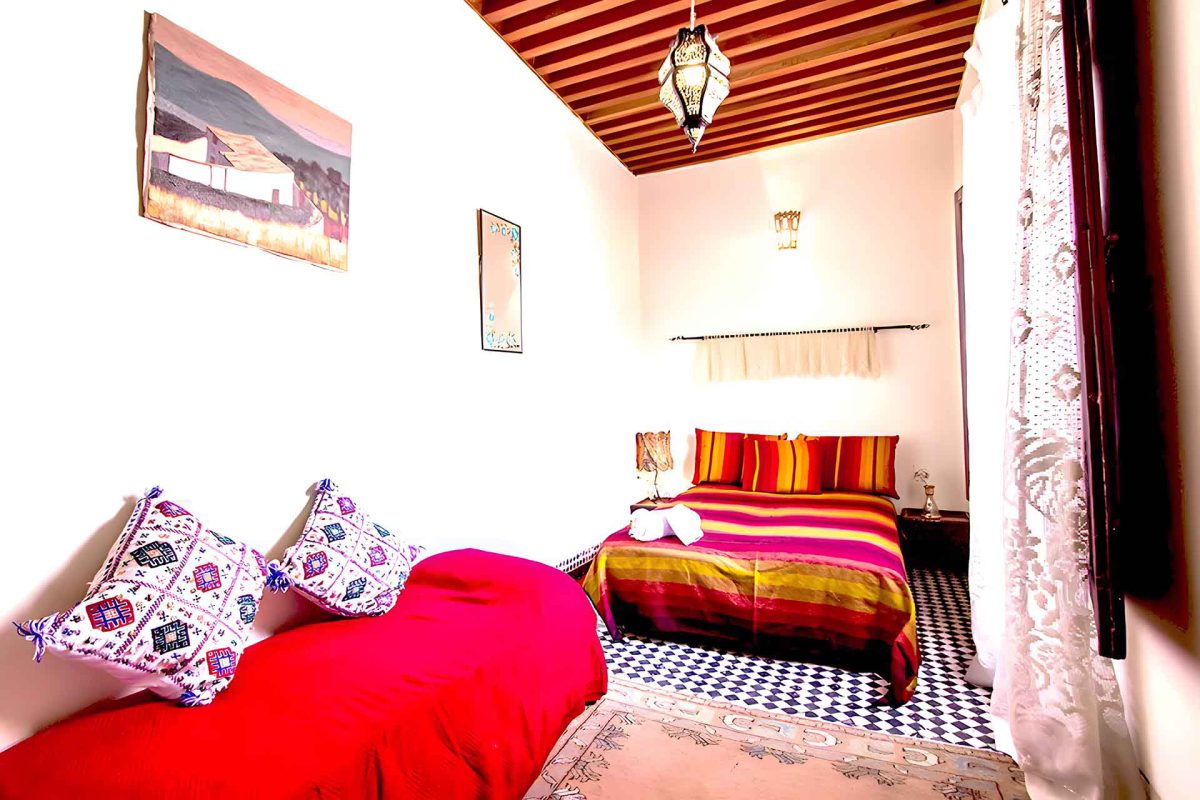 Spacious 19 m² room with a large double bed and sofa bed. Enjoy a private bathroom, inner courtyard view, air conditioning, and a quiet, traditional Moroccan atmosphere.